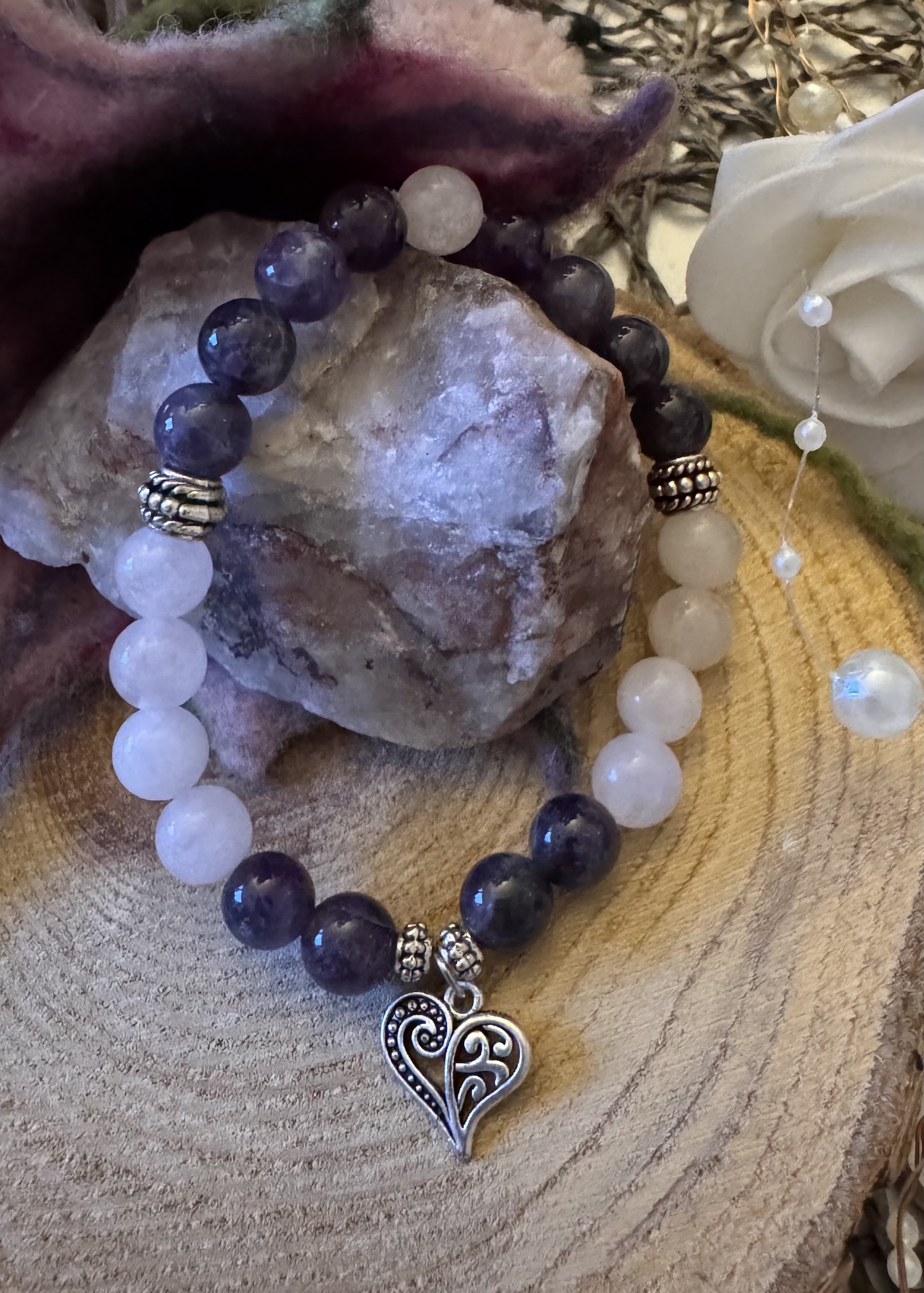 Armband aus Rosenquarz & Amethyst mit Herz-Anhänger – liebevoll, harmonisierend und klärend. 💗💜❤️