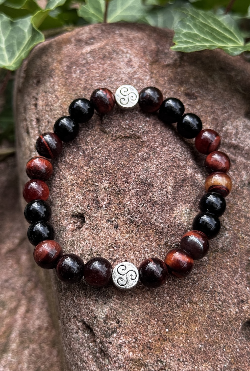 Armband aus Onyx und rotem Tigerauge mit Triskele-Anhänger