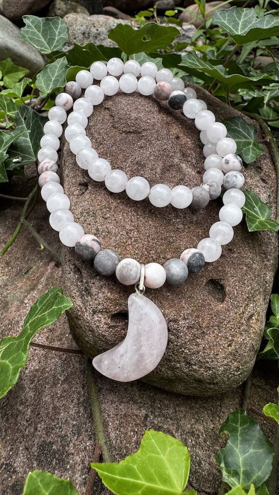 Halskette aus Rosenquarz und Zebra Jaspis mit einem Rosenquarz Mond