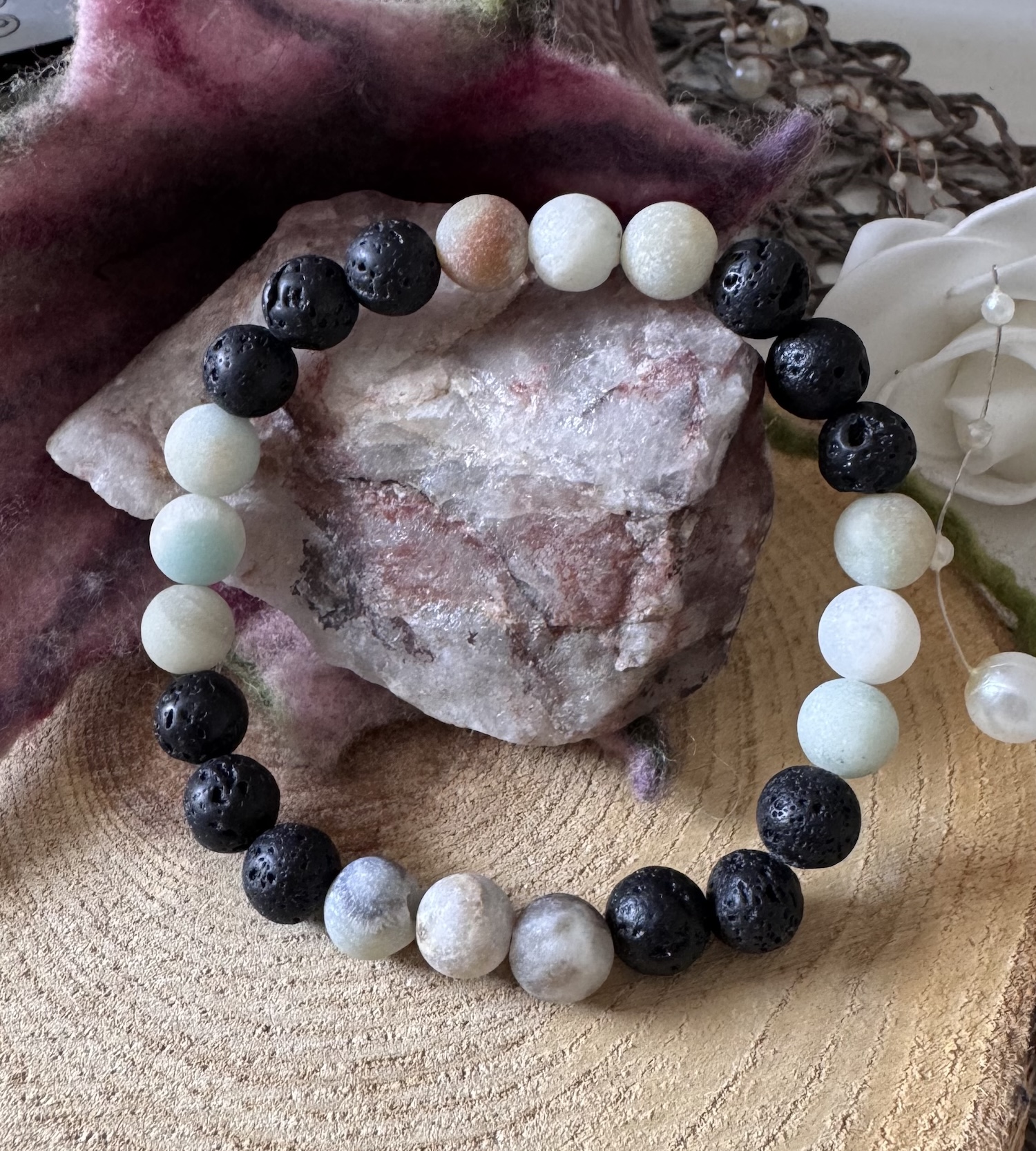 🔮 Spiritueller Impuls: Dieses Armband vereint die tiefe Erdung der Lava mit der sanften, fließenden Energie des Amazonits – wie ein sicherer Fels inmitten beruhigender Wellen.